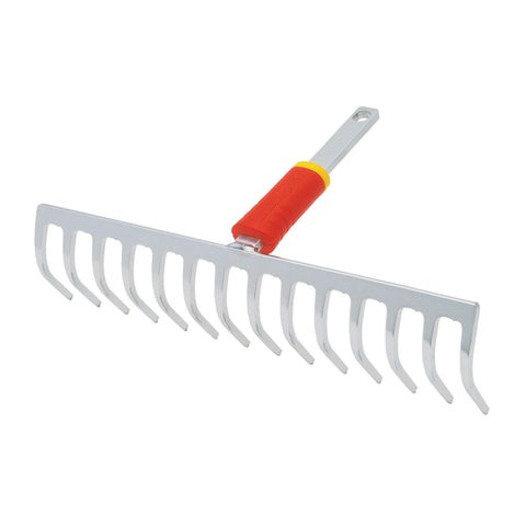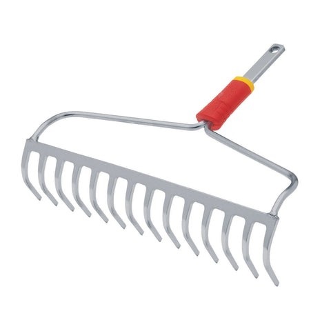 The Interlocken DRM35 Large Soil Rake is designed for even crumbling with little effort. The curved steel tines on the front of the rake easily pull through the soil. The flat surface on the back of the rake creates an even and tidy bed of soil. |