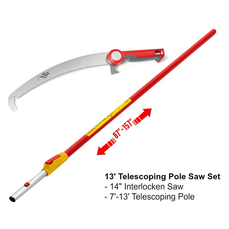 Tree trimming has never been easier or safer with this combo-kit from MobToolShop which includes an Interlocken Handle that extends to 13' making tree cutting and trimming safer than ever. With both feet on the ground, you can easily reach branches that need a trim without the use of a ladder. This handle remains incredibly light, yet heavy-duty and easy for anyone to use. The handle has multiple length positions so you can easily select what length you need. The telescoping feature of this handle enables the inner pole to extend and click into place like a seat belt. There's no annoying twisting or turning to come undone making this safer than anything else you've used on the market.